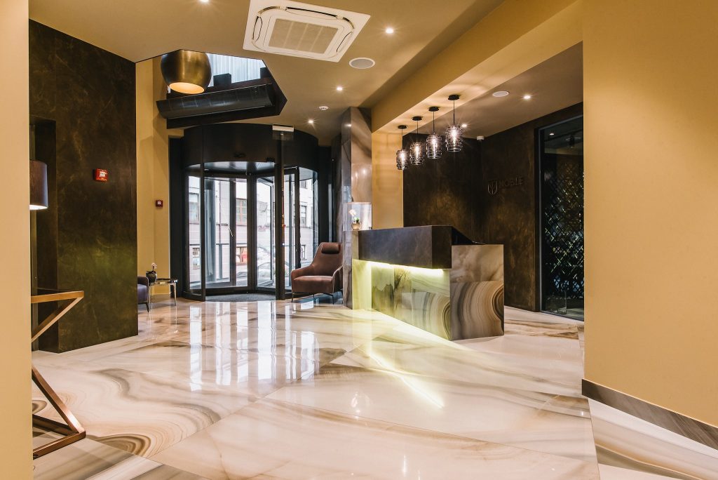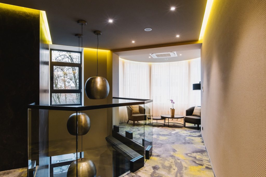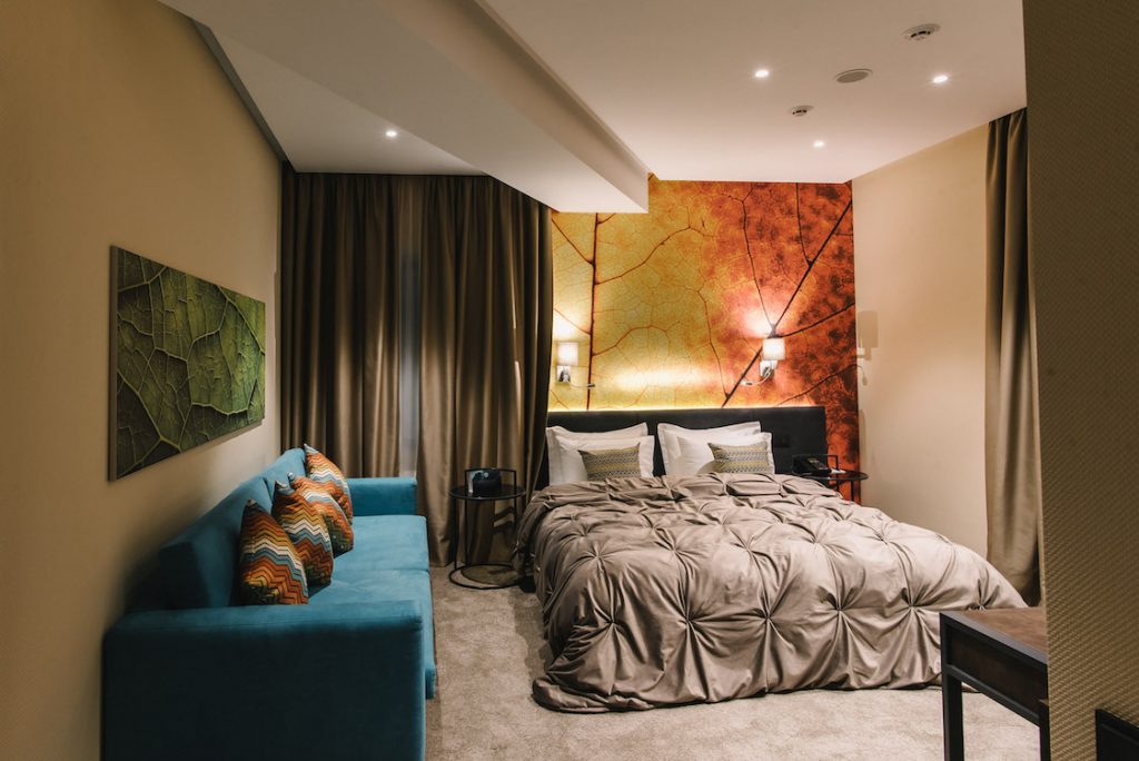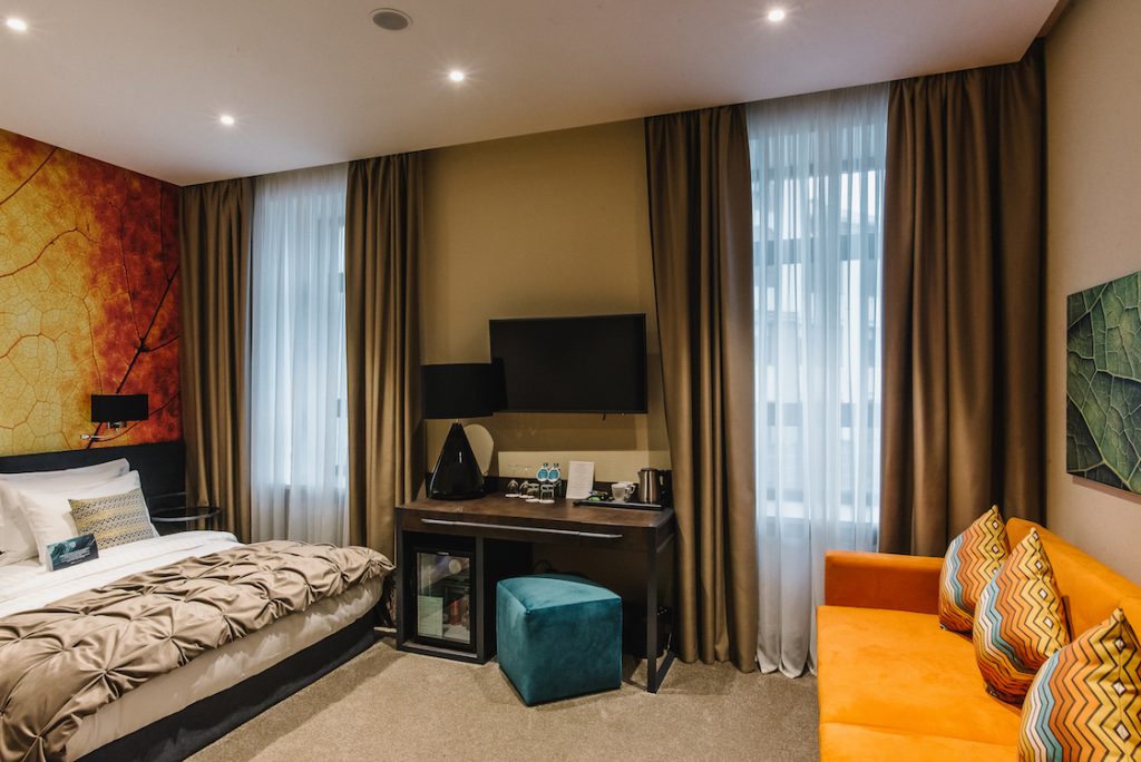 Просторий номер площею 31 м2, наповнений світлом великих вікон. Кожна деталь номеру унікальна, оскільки він зі смаком обставлений дизайнерськими меблями. Містить ліжко з ортопедичним матрацом 160 см завширшки, кондиціонер, міні-бар, сейф, стаціонарний телефон, smart телевізор і потужний Wi-Fi. Ванна кімната номеру облаштована душовою кабіною.