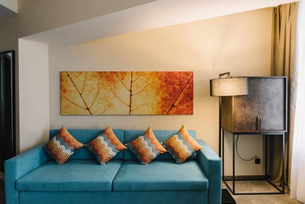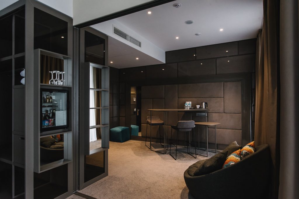 Dwupokojowy przestronny pokój, zaprojektowany z myślą o maksymalnym komforcie dla dwóch lub więcej osób, jest również najlepszym rozwiązaniem na wakacje z rodziną. Pokój jest przeznaczony dla sypialni i salonu. W sypialni panuje atmosfera przytulności oraz relaksu, a w salonie można spędzić czas w komfortowych warunkach. Każdy pokój jest wyjątkowy, ponieważ jest gustownie urządzony designerskimi meblami. W sypialni znajduje się łóżko o szerokości 160 cm z materacem ortopedycznym, a pokój dzienny to rozkładana sofa, która może pomieścić więcej niż dwie osoby, jeśli zajdzie taka potrzeba. Pokój wyposażony jest w klimatyzację, minibar, sejf, telefon stacjonarny, smart telewizor i potężny bezprzewodowy dostęp do Internetu. W łazience znajduje się kabina prysznicowa.